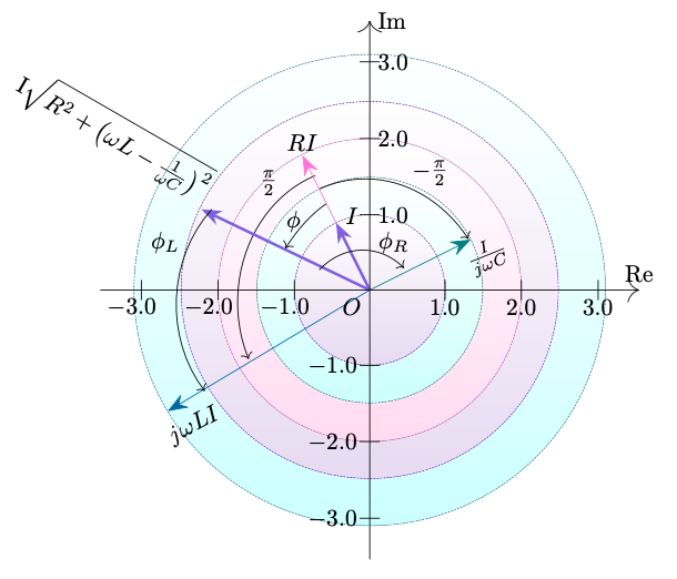 \draw[<-](-1.25,0.62)arc[x radius=2,y radius=3.8, start angle=130,end angle=110]; \draw(-0.9,1.3)node[below left]{$\phi$}; \draw(-3.8,2.3)node{ \rotatebox{-30}{I$\sqrt{R^2+\left(\omega L-\frac{1}{\omega C}\right)^2 }$}}; \draw(0,0)node[below left ]{$O$}; \draw[-{>[scale=2]}](0,-4)--(0,4)node[right]{Im};